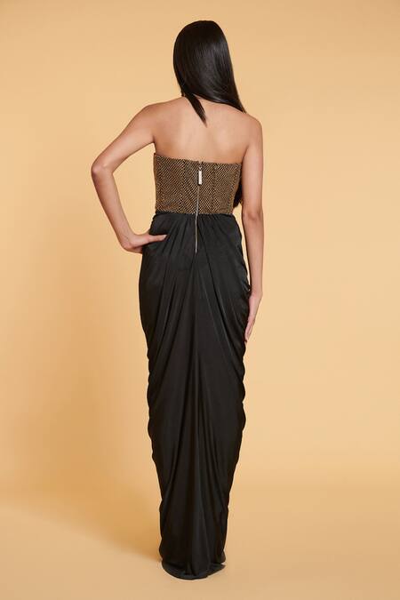 Black Grecian draped spandex gown with olive crystal mesh bodice.