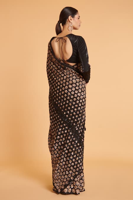 Black saree featuring gold sequin hand embroidery in a honeycomb pattern. Paired with a churidar sleeve shimmer knit blouse.