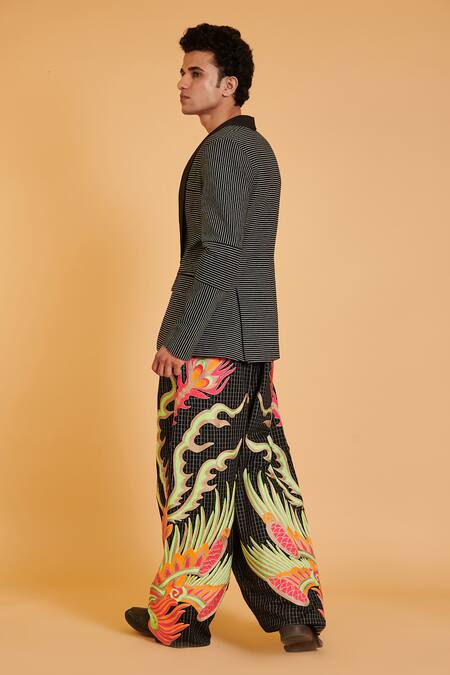 Black Kota Doria Horizontal Stripe Print Tuxedo Blazer