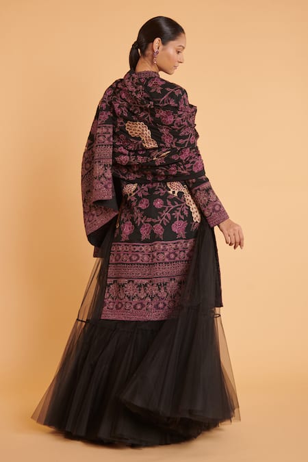 Black dupatta featuring Kashmiri zari embroidered floral and bird motifs embellished with crystals