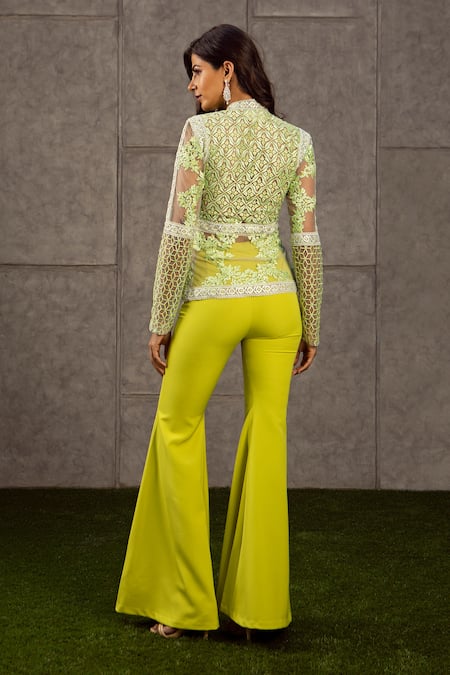 Green fitted pant with bell bottoms.