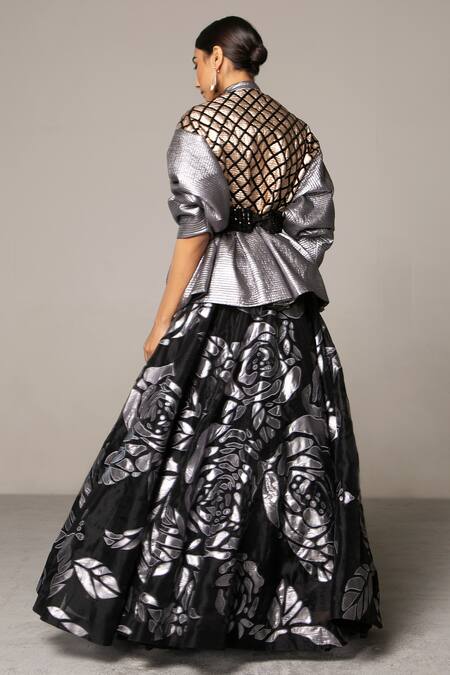 Black, gold, gun metal jacket with contrast panels, puff sleeves, velvet stripes & quilted detail.