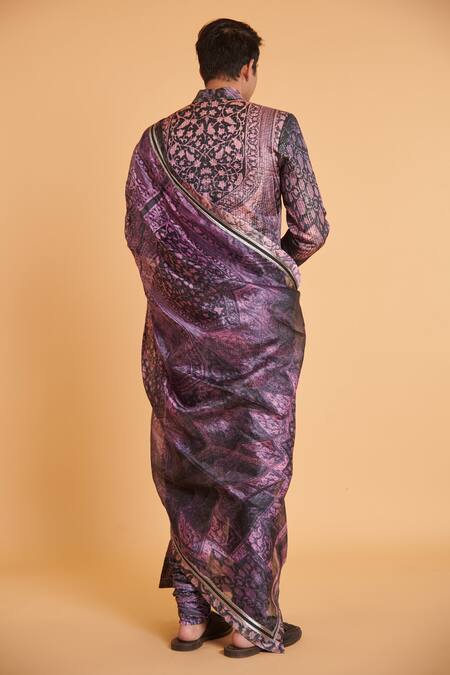 Purple Taffeta, Organza, Linen Embroidery Mughal Print Sherwani Churidar Set