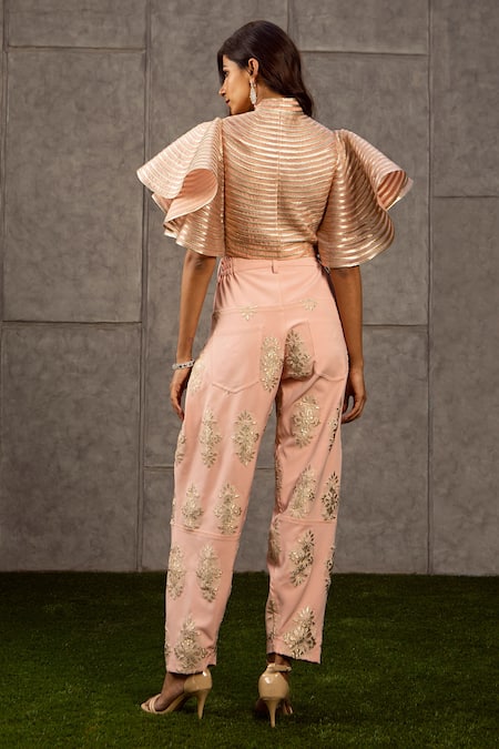 Peach front-zipper crop top with metallic horizontal stripes & cascade flared sleeves.