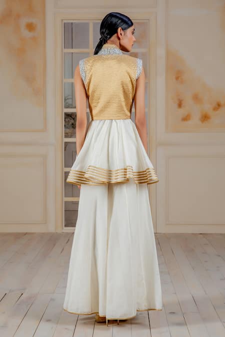 Gold cropped gilet jacket with crystal highlights & quilted texture.