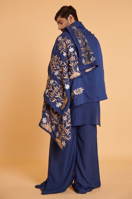 Blue kurta featuring a solid base with a mandarin collar and full sleeves. Paired with flap attached pant for a cohesive look.