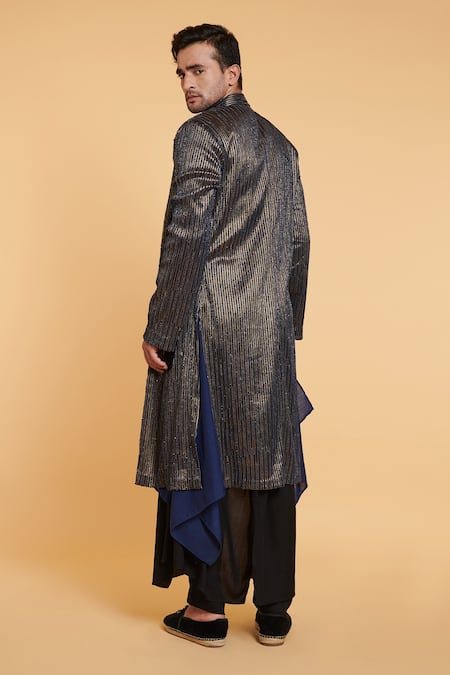 Blue and gold achkan with striped pattern embroidery in crystal and bead work. Comes with draped kurta & pant.