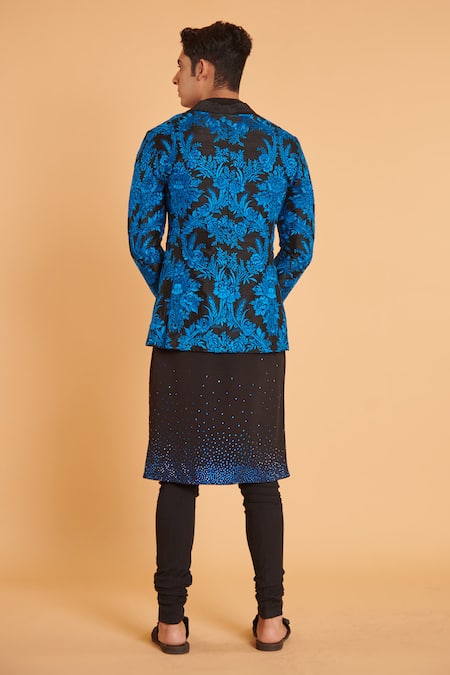 Black blazer featuring full sleeves, shawl collar, and intricate thread embroidery. Paired with matching pants, this set showcases a floral pattern crafted in Tussar fabric.