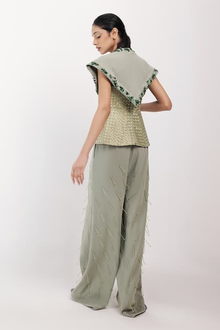 A light green scarf crafted from poly Japanese crepe, featuring scattered green hand embroidery tracing its border.