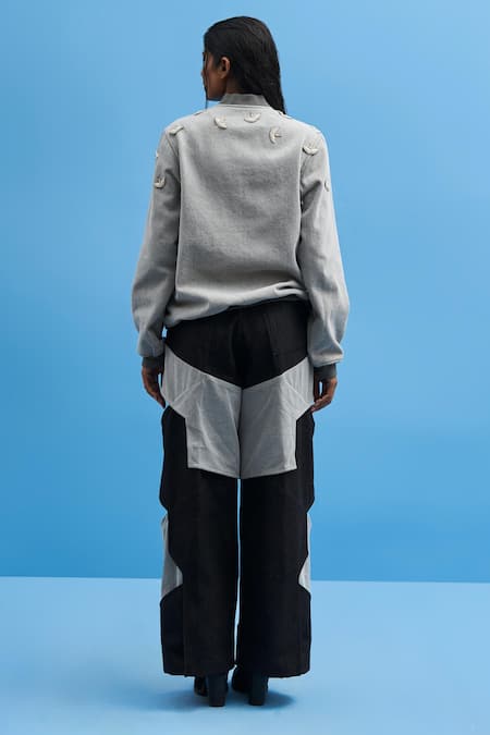 Grey bomber jacket featuring hand embroidered crane pattern on the bodice and pockets