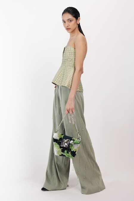 Intricate green and white bead embroidery, Metallic clasp closure, Metallic chain strap