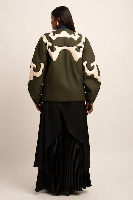 Olive green bomber jacket featuring beige patchwork embroidery in an abstract pattern