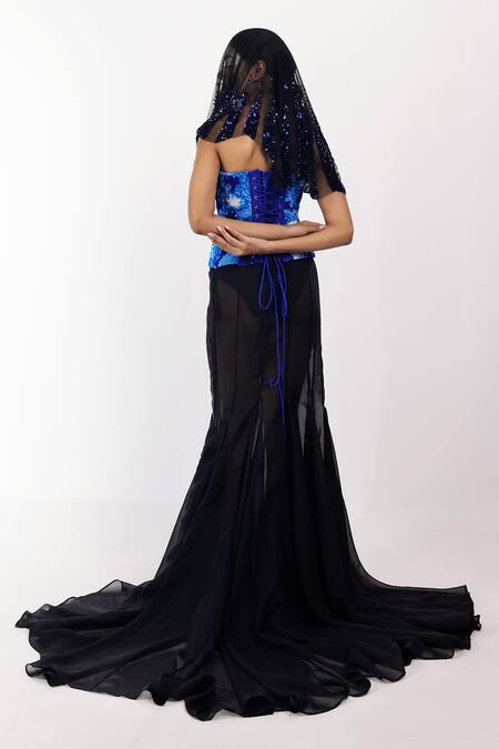 A black veil crafted from 100% cotton tulle, featuring hand-embroidered sequins in shifting shades of blue.