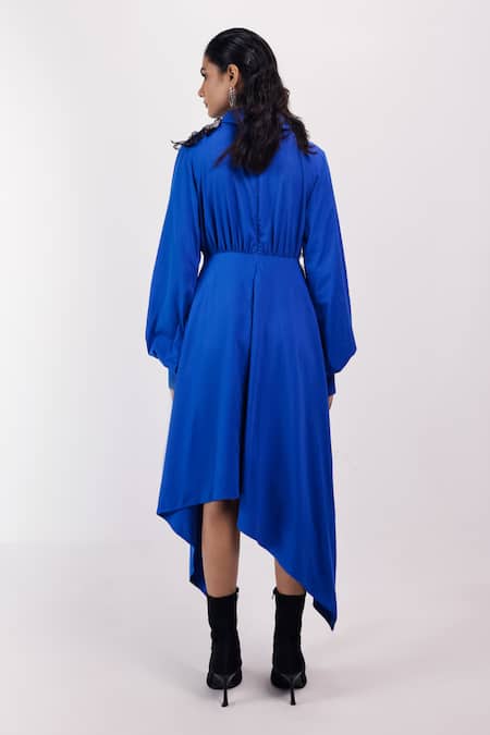 A vibrant blue dress crafted from 100% cotton tencel, featuring a structured collar, balloon sleeves, and an asymmetric hem with an elongated back.