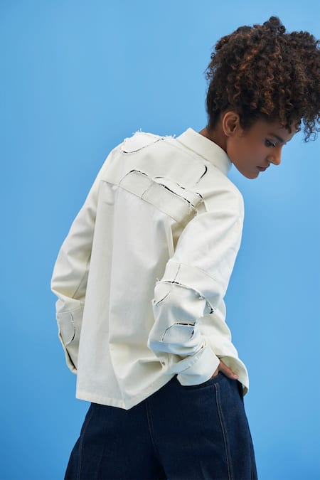 Off white shirt featuring a spread collar and full sleeves with frayed patchwork detailing