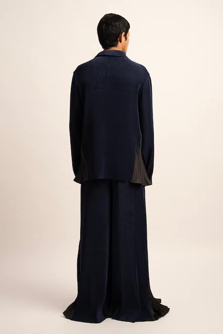 Navy blue flared trouser featuring all over ribbed detailing and contrasting pleated flare on the sides