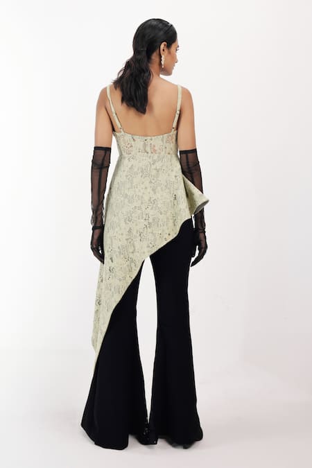 Dense black sequin embellished cups, Asymmetrical draped hem, Structured corsetry design