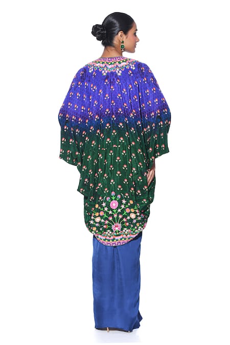 Blue and green ombre batwing sleeves front open shrug with baroque bloom print and clustered beads hand embroidery on the borders. Paired with a purple blouse featuring fleur print and a blue draped skirt with cascading front pleats detailing.
