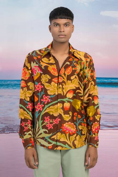 Brown silk shirt featuring a multi-color floral pattern and full sleeves