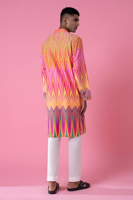 Multicolor kurta featuring a chevron print, mandarin collar, and full sleeves. Paired with a contrasting ivory pant.