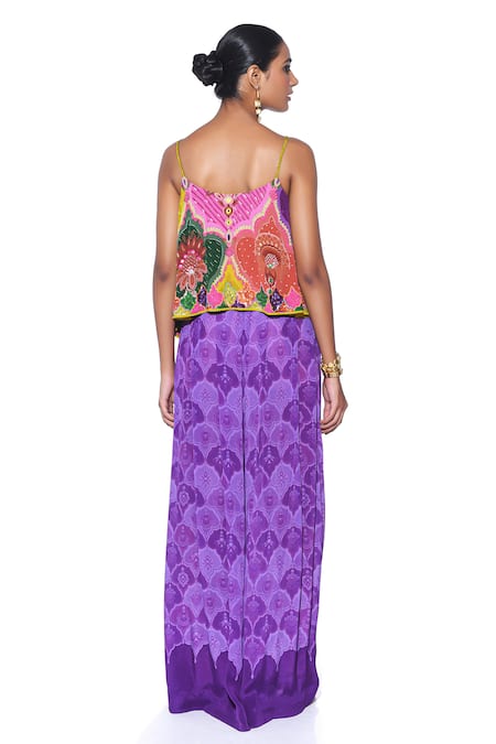 Multicolored paisley pattern top featuring hand embroidery and a square neckline. Paired with a violet self print pleated palazzo.