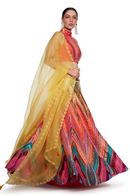 Multicolored lehenga with waves & floral embroidered motifs. Paired with embroidered sleeveless blouse & contrast organza dupatta.