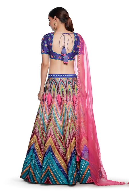 Multicolored lehenga with wave embroidered pattern, floral & sequin work. Paired with floral embroidered blouse & pink organza dupatta.