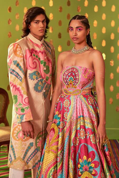 Pink suede velvet sherwani featuring floral abstract printed patterns. Paired with a churidar made of cotton silk.