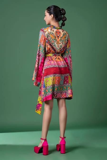 Multi-colored rayon twill wrap dress featuring floral and abstract prints. Comes with a coordinating belt for added style.