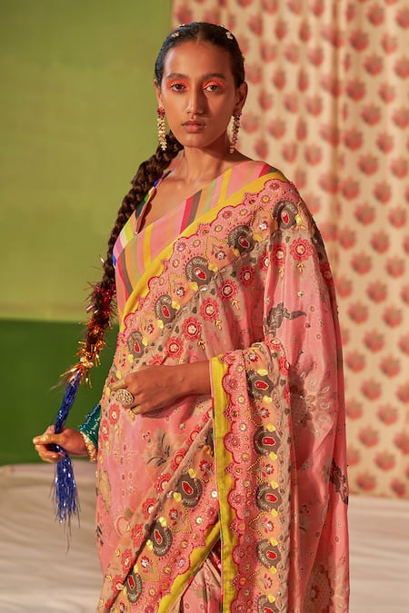 Twilight pink ombre saree featuring hand embroidered floral designs and a contrasting border with hamsa details. Paired with a scalloped striped blouse in vibrant colors.