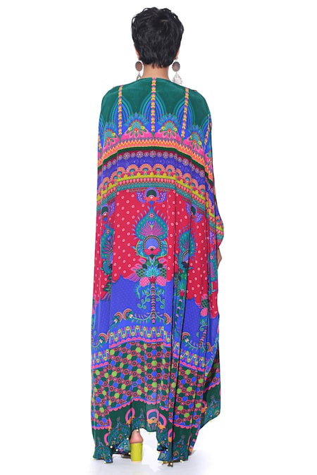 Multicolor floral and geometric print asymmetric cape embellished with ghungroo on the hem. Paired with a matching embellished blouse and harem pant.