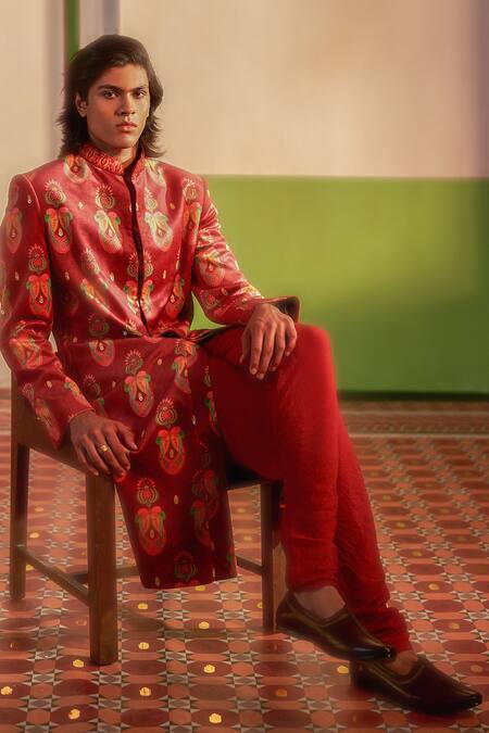Floral print patterns on sherwani, Mandarin collar design, Front hook closure