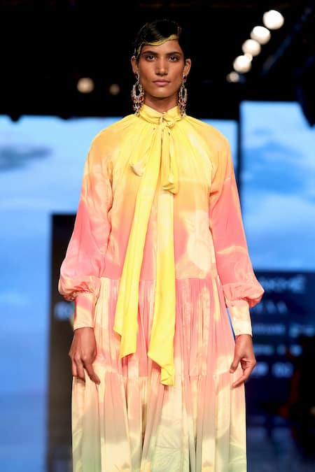 Pink, yellow shaded dress with floral printed motifs, puff sleeves, tiered hems and tie up at the neckline.