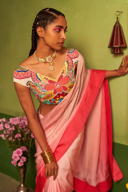 Pink ombre saree crafted in satin, featuring a padded hand embroidered blouse. The blouse showcases intricate cutdana, sequin, and bead work with a V neck and cap sleeves.