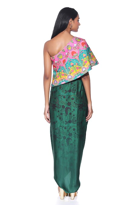 Pink and teal embroidered one-shoulder top featuring an asymmetric sleeve. Paired with a bottle green self paisley print draped skirt.