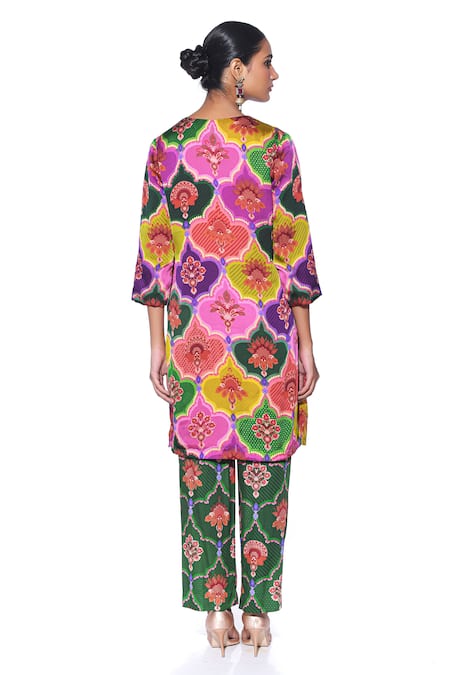 Multicolored paisley pattern kurta featuring a V neck and three-quarter sleeves. Paired with contrasting bottle green pants for a complete look.