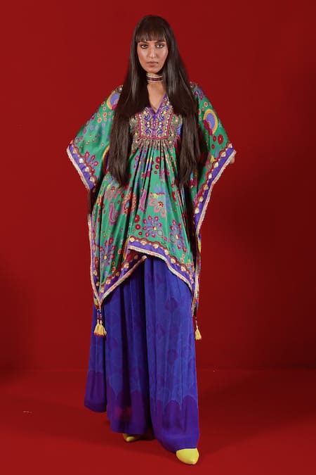 Emerald green kaftan top featuring a V neck with paisley print and hand embroidery. Paired with navy blue pleated palazzo pants in a self print design.