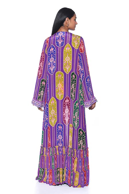 Purple blouse with plunging V neckline and scallop detailing. Paired with a matching tiered sharara and a long embroidered shrug featuring a paisley print and hand-embroidered border.