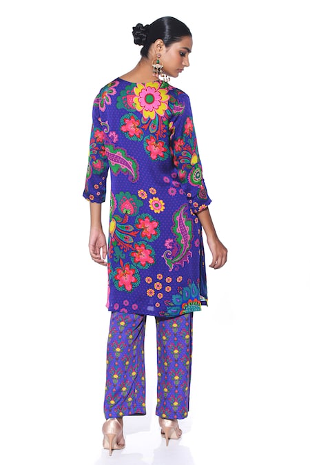 Twilight blue oversized kurta featuring a vibrant paisley print and three-quarter sleeves. Paired with matching printed pants in a coordinating design.