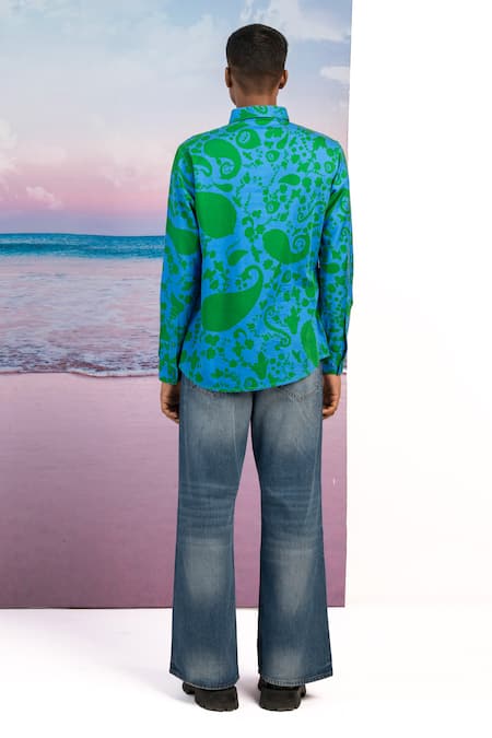 Ibiza blue shirt crafted in cotton satin featuring a paisley print and full sleeves