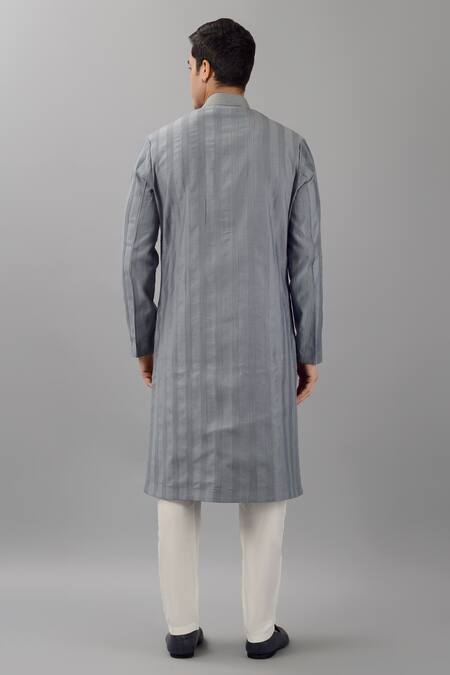 Grey silk kurta featuring thread embroidered collar and placket with pintucked details. Paired with a white pant for a complete look.