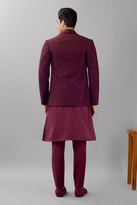 Deep wine Jodhpuri jacket featuring a shawl collar with geometric pattern and tonal thread, cut dana & bead embroidery. Paired with an embroidered mandarin collar kurta and matching trouser.