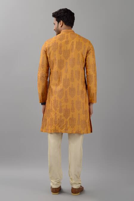 Mustard yellow muga silk kurta featuring thread embroidery and a mandarin neck. Paired with matching pant for a complete look.