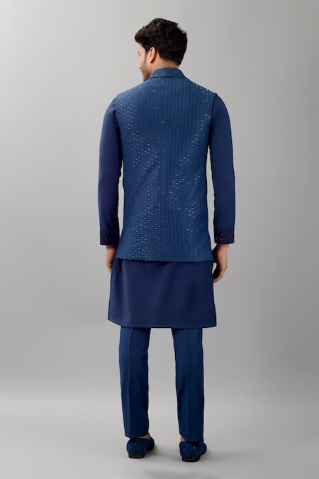 Blue bundi featuring a shawl collar and sleeveless design with cut dana and thread work