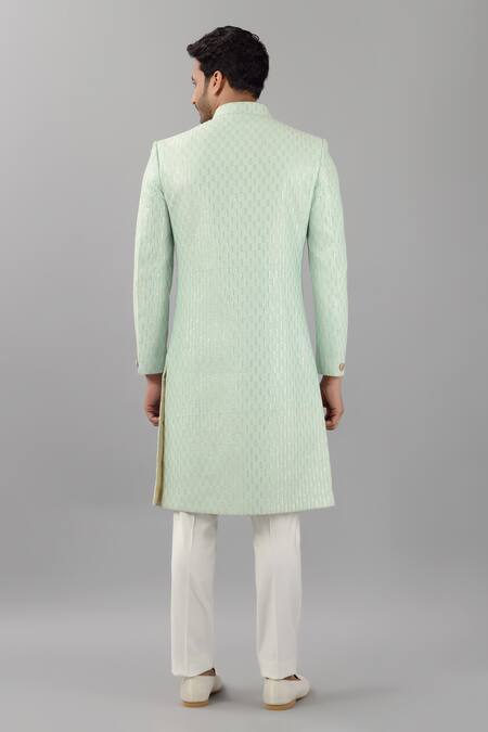 Sea green silk sherwani featuring gold sequins and tonal thread embroidery. Paired with off-white slim-fit trouser.