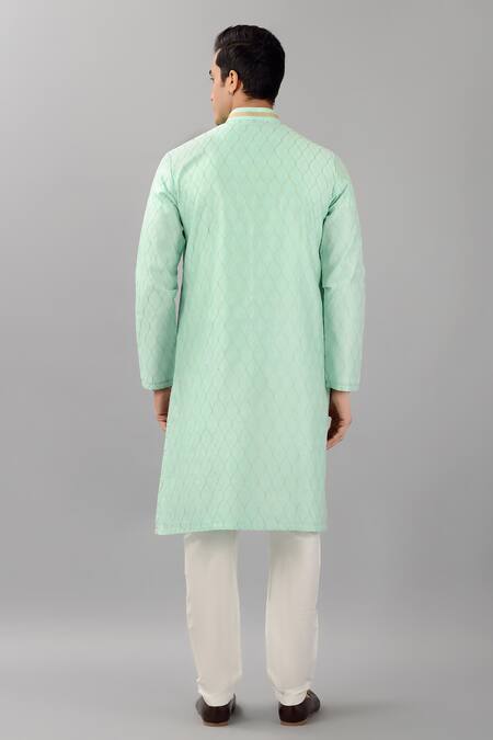 Aqua green silk kurta featuring a mandarin collar, embroidered collar & placket with gold and silver thread work. Paired with white straight fit pants.