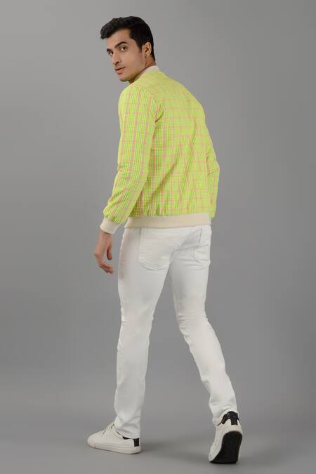 Yellow bomber jacket featuring a checkered pattern, round collar, and full sleeves