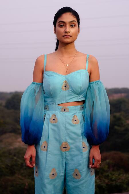 Blue bustier style jumpsuit with contrast butta details, with cut-out panels at the waist & detachable organza dyed sleeves.