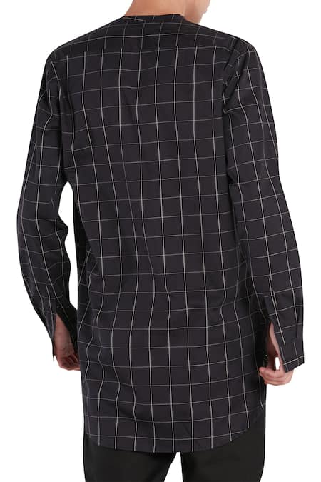 Sultry, quirky & swanky this black classic cotton shirt features check print all over with a quirky side button placket look.