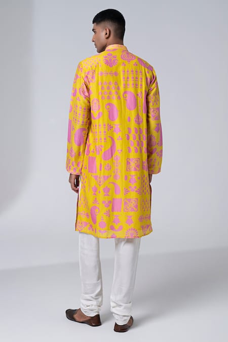 Lemonade yellow kurta featuring hamsa self print and mandarin collar. Paired with a contrast ivory churidar.